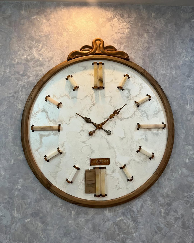 فریم چوب طبیعی و عقربههای طرحدار فلزی، اعداد سنگ نمک و مرمر طبیعی که حس گرما، اصالت و ظرافت رو در دکور شما زنده میکنن.